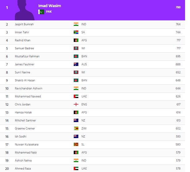 එ අනුව ඉමාඩ් වසීම් ප්‍රසාද ලකුණු  780 ලබා මෙහි පෙරමුණට පැමීණ ඇත.