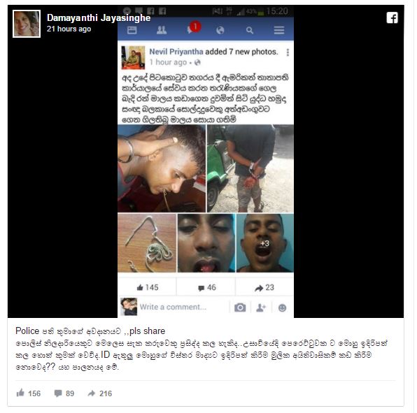 කොළඹ නගරයේ පොලිස් ස්ථානයකට අනුයුක්තව සේවය කරන පොලිස් පරීක්ෂකවරයෙකු විසින් , මාලයක් කැඩීමේ වරදට අත් අඩංගුවට ගන්නා ලද ශ්රී ලංකා යුධ හමුදාවේ පාබල රෙජිමේන්තුවේ සෙබලෙකුගේ ජායාරූප සිය ෆේස්බුක් ගිණුමට එකතුකර තිබෙන අතර එයට දැඩි මහජන විරෝධයක් එල්ල වෙමින් තිබේ.