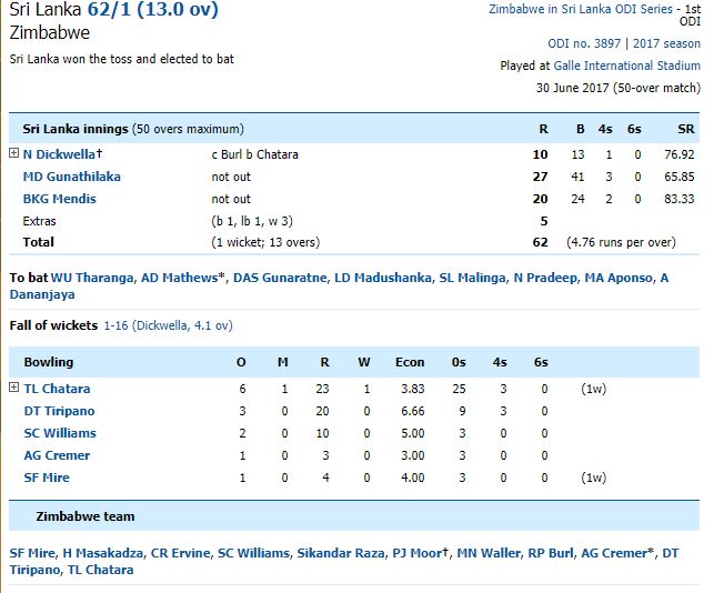 එ අනුව පන්දුවාර 13 ක් අවසානයේ එක් කඩුල්ලක් පමණක් දැවී ශ්රී ලංකා කණ්ඩායම ලකුණු 62 ක් ලබා සිටියි.