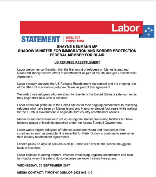 ඕස්ට්රේලියා රැඳවුම් කඳවුරුවල සිටි සරණාගතයන් ඇමෙරිකා එක්සත් ජනපදයේ නැවත පදිංචි කිරීමේ ගිවිසුමේ කොටසක් ලෙස එහි යාම තහවුරු වූ මනුස් හා නාවුරු දුපත්වල සරණාගතයින් පළමු පිරිසට සිය සුබපැතුම් පිරිනමන බව ඕස්ට්රේලියා ලේබර් පක්ෂය කියයි. මේ සම්බන්ධයෙන් එක්සත් ජනපදයේ සරණාගතයින් නැවත පදිංචි කිරීමේ ගිවිසුම හා එක්සත් ජාතීන්ගේ සරණාගතයින්ගේ කාර්යාලයේ මෙහෙය අනුමත කරන කම්කරු පක්ෂය ගිවිසුමට දැඩි ලෙස සහාය දෙන බවද කියා සිටීයි.