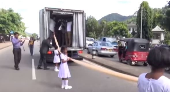 මෙම සාරි පොට ගෙන එනු ලැබුවේ ලොරියක පටවා වන අතර කිලෝ මීටර් 3.2ක් දුරට රදවා සිටි පාසැල් සිසු සිසුවියන් 250ක් විසින් එය අල්ලාගෙන සිටියහ.