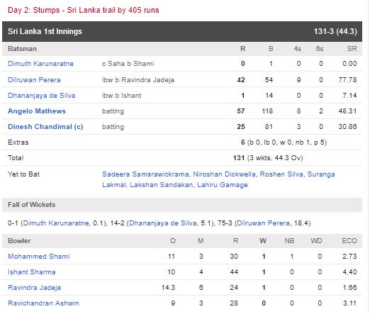 එ අනුව ඉන්දීය කණ්ඩායම සිය පළමු ඉනිම සඳහා කඩුළු 07 ක් පමණක් දැවී ලබාගත් ලකුණු 536 ට වඩා ශ්රී ලංකා කණ්ඩායම තවත් ලකුණු 405 ක් පසු පසින් සිටියි.