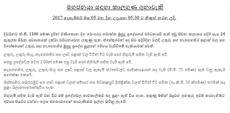 දිවයිනට කි.මී. 1100 පමණ දුරින් ගිණිකොන දිග බෙංගාල බොක්ක මුහුදු ප්රදේශයේ වර්ධනයවී ඇති අඩු පීඩන කලාපය ඉදිරි පැය 24 ඇතුලත පීඩන අවපාතයක් දක්වා වර්ධනය වන ලකුණු ඇති බව, කාළගුණවිද්යා දෙපාර්තුමේන්තුව අද (05) පෙරවරු නිකුත් කළ නිවේදනයෙහි සඳහන් වෙයි.