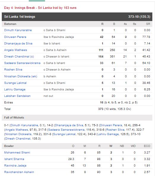 එ අනුව ශ්රී ලංකා කණ්ඩායම ඉන්දීය කණ්ඩායම කඩුළු 07 ක් පමණකද් දැවි සිය පළමු ඉනිම වෙනුවෙන් රැස් කළ ලකුණු 536 ට වඩා තවත් ලකුණූ 163 ක් පසු පසින් සිටියි.