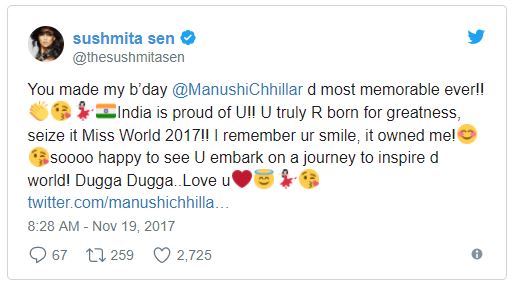 පසුගිය නොවැම්බර් 18 වැනිදා චීනයේ පැවති ‘ලෝක රූ රැජිණ‘ තේරිමේ තරගය ජයගන්නට සමත්වූ ඉන්දියාවේ 20 වැනි වියෙහි පසුවන මනුෂි චිල්යර්ට සුබපැතුම් එක් කිරීමට වර්තමානයේ බොලිවුඩ් සිනමා නිළියන් බවට පත්ව සිටින සුස්මිතා සෙන්, අයිශ්වර්යා රායි, ලාරා දත්තා, ප්රියංකා චොප්රා ඇයට ට්විටර් පණිවිඩ එක්කර ඇති බව වාර්තා වේ.