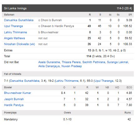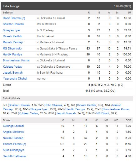 ධර්මශාලා හිදී පැවති මෙම තරඟයේ කාසිය වාසිය දිනූ ශ්රී ලංකා නායකයාගේ ඇරයුමෙන් පළමුව පන්දුවට පහර දුන් ඉන්දීය කණ්ඩායම සියල්ලන් දැවී ලකුණු 112ක් රැස් කළේය.