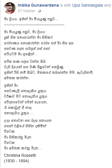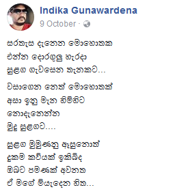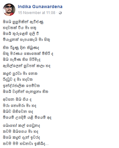 සමාජ ජාලා තුළ කවි රචනා කරන්නෙකු ලෙස ප්රකට වූ ඉන්දික ගුණවර්ධන අද (13) හදිසි හෘදයාබාධයකින් ජීවිතයෙන් සමුගත්තේය.
