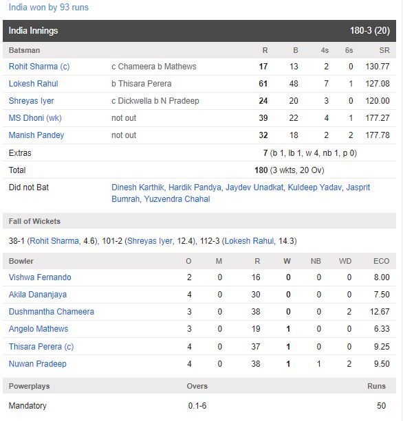 සංචාරක ශ්රී ලංකා කණ්ඩායම සමග කටක්හි පැවැති පළමු වැනි විස්සයි – 20 තරගයෙන් ලකුණු 93ක ජයක් වාර්තා කරමීන් තරග තුනකින් සමන්විත විස්සයි20 තරගාවලිය 1-0ක් ලෙස පෙරමුණ ගැනීමට ඉන්දීය කණ්ඩායම සමත්විය.