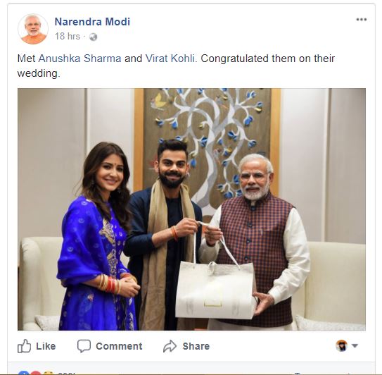 නව යුවල තමන් හමුවීමට පැමිණ තමන්ට ඇරැයුම් කළේ යැයි පවසමින් මෝදි ඉන්දීය ක්‍රිකට් නායක කෝලි සහ බොලිවුඩ් සුරූපිනී අනුෂ්කා ෂර්මාගේ ඡායාරූප ට්විටර් ගිණුම ඔස්සේ ප්‍රසිද්ධියට පත් කර තිබේ.