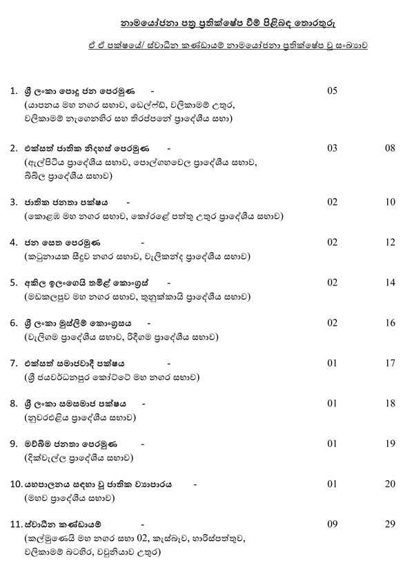 පොදුජන පෙරමුණේ 05 ඇතුළුව නාමයෝජනා 29 ක් ප්‍රතික්ෂේපයි..
