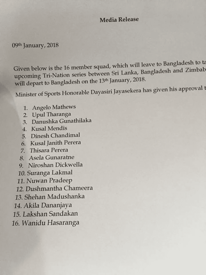 මෙම සංචිතය 13 වැනිදා බංග්ලාදේශය බලා පිටත්ව යෑමට නියමීත බවත් ශ්රී ලංකා ක්රිකට් ආයතන නිවේදනයෙහි සඳහන් වෙයි.