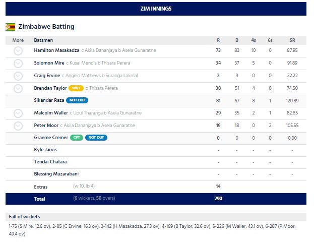 ශ්රී ලංකාවට සිම්බාබ්වේ කණ්ඩායමෙන් ලකුණූ 291 ඉලක්කයක්..