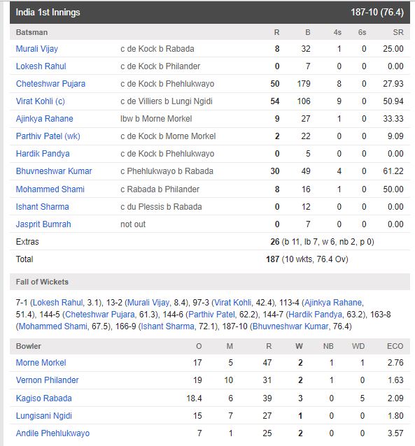 එ අනුව ඉන්දීය කණ්ඩායම සියළු දෙනා දැවි සිය පළමු ඉනිමට රැස් කළ ලකුණූ 187 ට වඩා තවත් කඩුළු 09 ක් අතැතිව ලකුණූ 181 ක් පසුපසින් අප්රිකානු කණ්ඩායම පසු වෙයි.