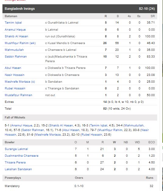 බංග්ලාදේශයේ පැවැත්වෙන තුන්කොන් එක්දින තරගාවලියේ 06 වැනි තරගයේ කාසියේ වාසිය දිනා පළමුව පන්දුවට පහර දුන් බංග්ලාදේශය කණ්ඩායම ලකුණූ 82 කට සීමා කිරීමට ශ්‍රී ලංකා පන්දු යවන්නෝ සමත් වුහ.