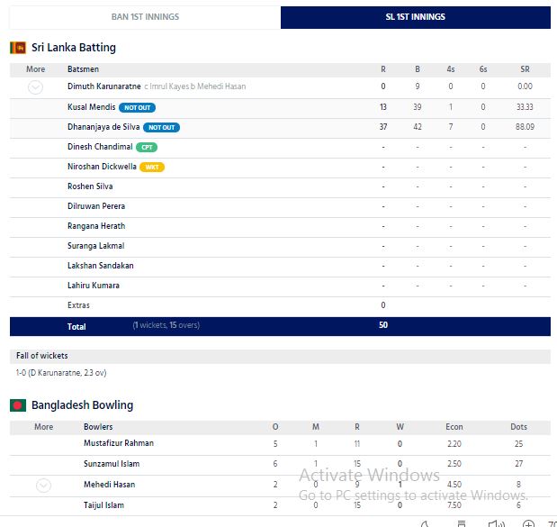 බංග්ලාදේශ කණ්ඩායම සමග පැවැත්වෙන පළමු ටෙස්ට් ක්රිකට් තරගයේ දෙවැනි දිනයේ තේ පානය සඳහා තරගය අත්හිටුවන විට සිය පළමු ඉනිම ක්රීඩා කරන ශ්රී ලංකා කණ්ඩායම එක් කඩුල්ලක් පමණක් දැවී ලකුණු 50 ක් රැස් කරගෙන සිටියේය.