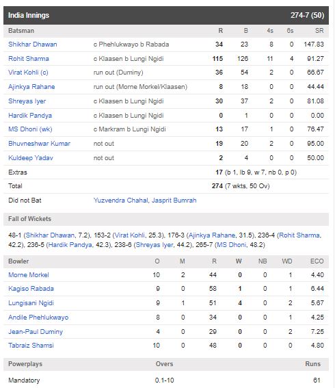 කාසියේ වාසිය දිනු දකුණු අප්‍රිකානු ආරාධනයෙන් පළමුව පන්දුවට පහර දුන් ඉන්දීය කණ්ඩායම සිය පන්දුවාර 50 අවසානයේදි කඩුළු 07 ක් පමණක් දැවී ලකුණු 274 ක් රැස් කළේය.