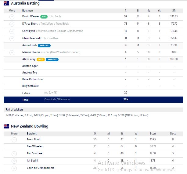 පිළතුරු ඉනිම ක්‍රීඩා කළ ඔස්ට්‍රේලියා කණ්ඩායම කඩුළු 05 ක් පමණක් දැවී ලකුණු 245 ක් ලබා ගනිමීන් සිය ජයග්‍රහණය වාර්තා කිරීමට සමත් විය.