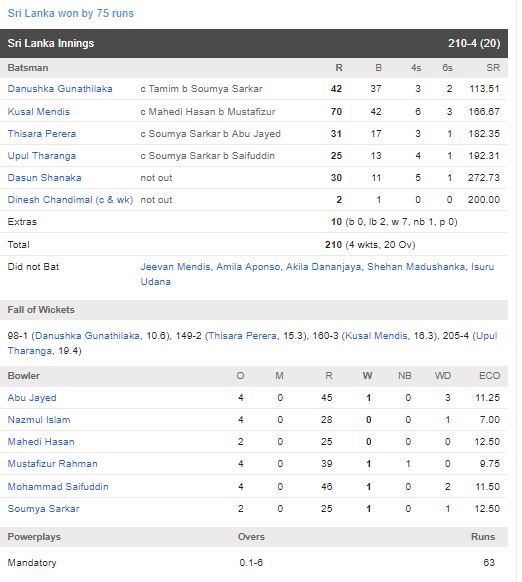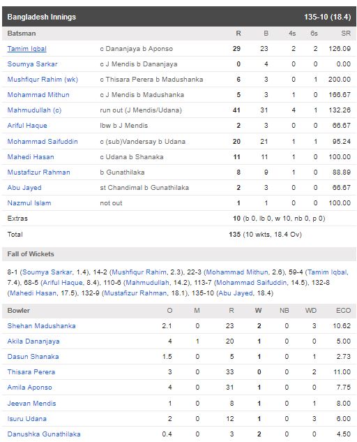 එ අනුව ලකුණු 211 ක ජයග්‍රාහි ඉලක්කයක් හඹා ගිය බංග්ලාදේශය කණ්ඩායමට පන්දුවාර 18 යි පන්දු 03 ක් තුල සියළු ක්‍රීඩකයින් දැවී රැස්කර ගත හැකි වුයේ ලකුණු 135 ක් පමණි.