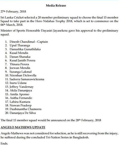 මාර්තු 06 වැනිදා ආරම්භ විමට නියමීත නිදහස් කුසලාන විස්සයි – 20 තුන්කොන් තරගාවලියට සඳහා වු 20 දෙනෙකුගන් යුත්ශ් රී ලංකා මූලික සංචිතයට ක්රීඩා අමාත්යවරයාගේ අනුමැතිය හිමීව ඇති බව ශ්රී ලංකා ක්රිකට් ආයතනය පවසයි.