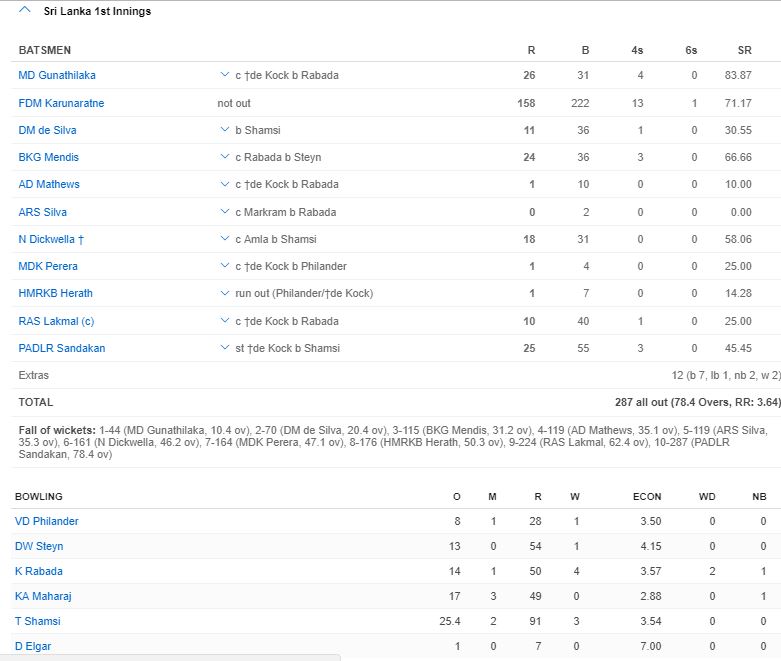 සත්කාරක ශ්රී ලංකා කණ්ඩායම සමග ගාල්ල ජාත්යන්තර ක්රිකට් ක්රීඩාංගනයේදි ඊයේ (12) ආරම්භ වු පළමු ටෙස්ට් ක්රිකට් තරගයේ පළමු දිනය අවසානයේ සිය පළමු ඉනිම ක්රීඩා කරමීන් සිටි සංචාරක දකුණූ අප්රිකා කණ්ඩායම එක් කඩුල්ලක් පමණක් දැවි ලකුණූ 04 ක් රැස් කර සිටියේය.