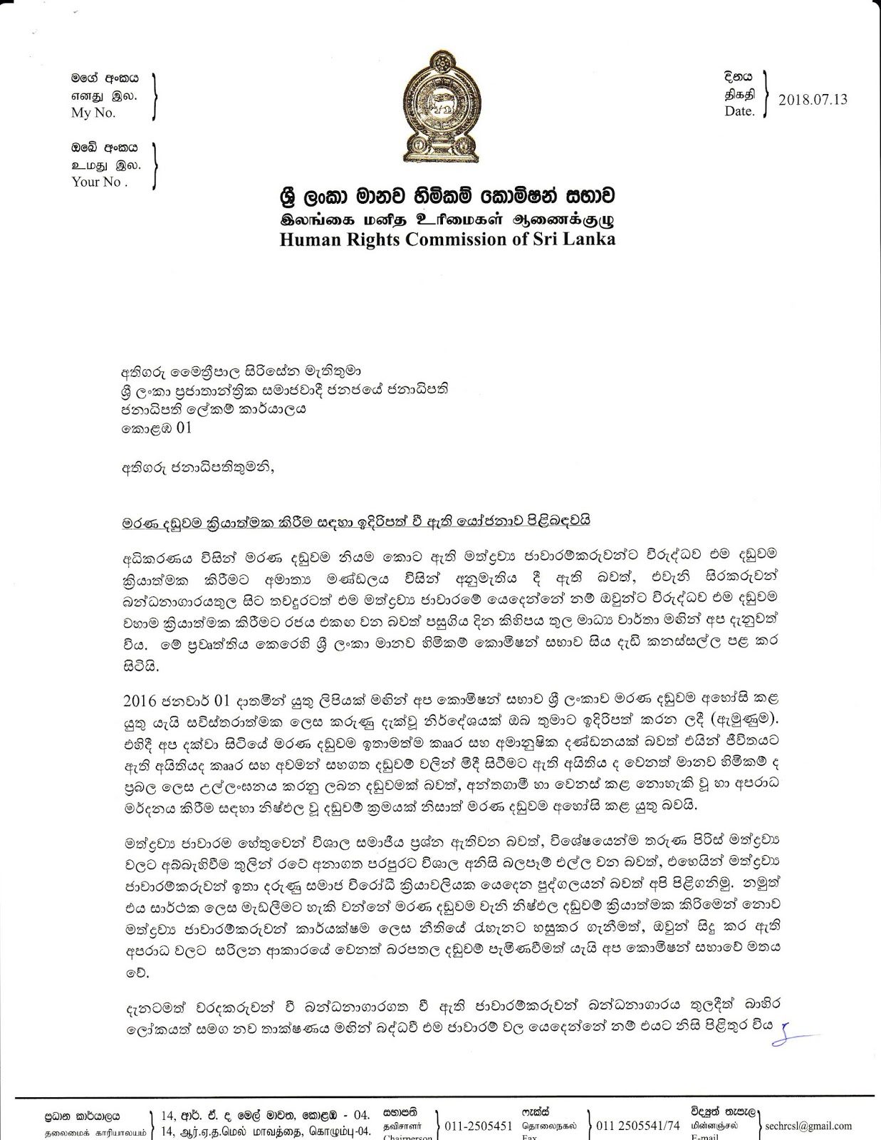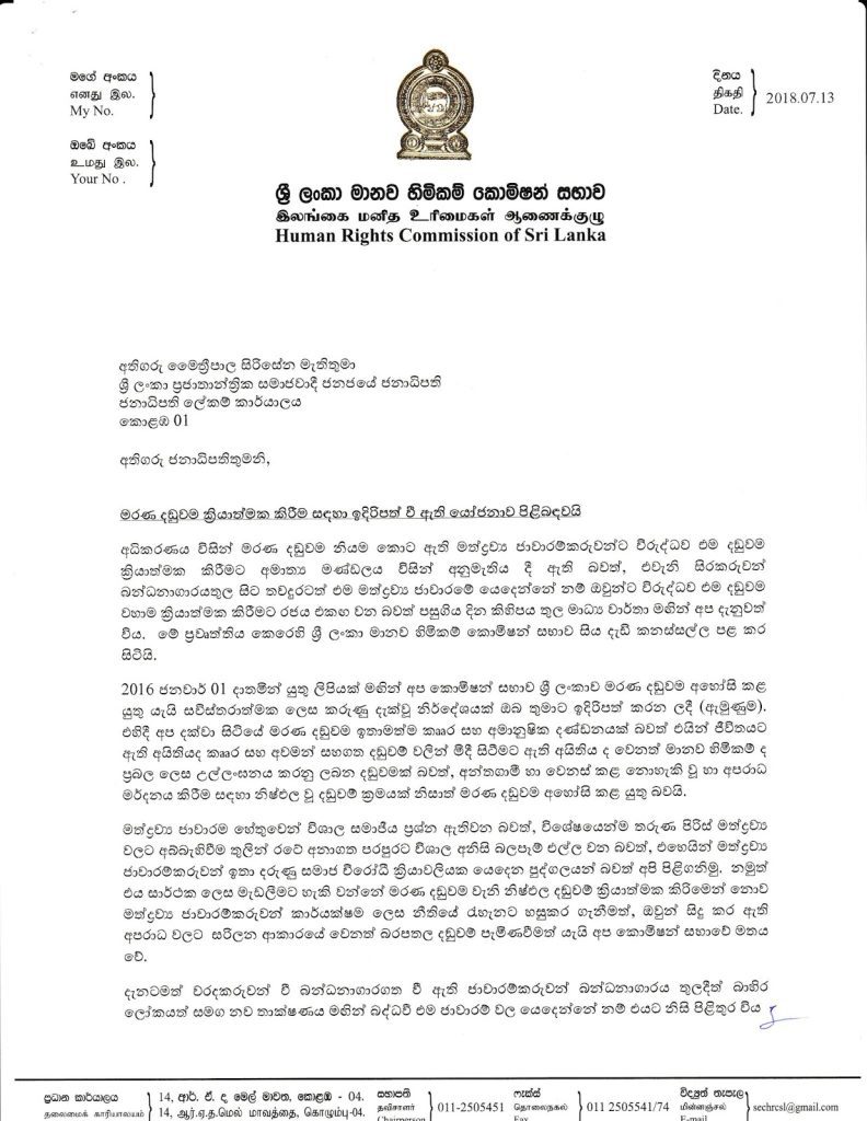 මත්ද්‍රව්‍ය ජාවාරම්කරුවන්ට මරණ දඬුවම ක්‍රියාත්මක කිරීමට රජය ගෙන ඇති තීන්දුව අහෝසි කර මත්ද්‍රව්‍ය ජාවාරම ඇතුළු බරපතල අපරාධ මර්දනයට අවශ්‍ය ප්‍රබල හා දීර්ඝ කාලීන ප්‍රතිපත්ති මාලාවක් ක්‍රියාත්මක කරන ලෙස ශ්‍රී ලංකා මානව හිමිකම් කොමිෂන් සභාව  ජනාධිපති මෛත්‍රීපාල සිරිසේන මහතාගෙන් ලිඛිතව ඉල්ලීමක් කර තිබේ.