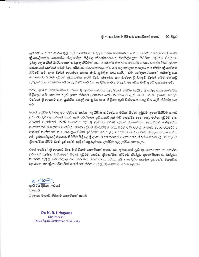 ඒ සම්බන්ධයෙන් සිය කොමිෂන් සභාවේ මතය ජනාධිපතිවරයා වෙත යවමින් කොමිෂන් සභාවේ සභාපති ආචාර්ය දීපිකා උඩගම මහත්මිය සඳහන් කර ඇත්තේ මරණ දඬුවම යනු ලෝකයේ තවදුරටත් ප්‍රතික්ෂේප වෙමින් බවතින දණ්ඩන ක්‍රමයක් බවයි.