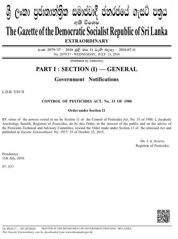 දිවයිනේ සියලු බෝග සඳහා ග්ලයිෆොසේට් තහනම ඉවත් කිරිමට පලිබෝධනාශක රෙජිස්ට්රාර්වරයා විසින් කටයුතු කර තිබේ.