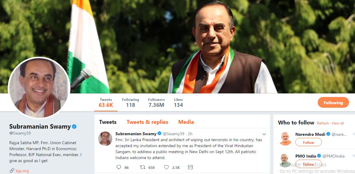 සුබ්‍රමනියම් ස්වාමී සැප්තැම්බර් 12 හිටපු ජනපතිව දිල්ලියට කැඳවයි..