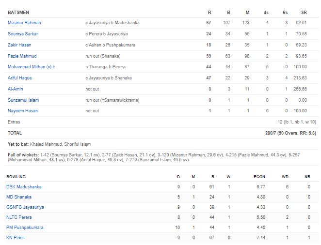 සංචාරක ශ්රී ලංකා ඒ කණ්ඩායම සමග පැවැත්වෙන තරග තුනකින් යුත් එක්දින තරගාවලියේ පළමු එක්දින තරගයේ (17) පළමුව පන්දුවට පහර දුන් බංග්ලාදේශ ඒ කණ්ඩායම කඩුළු 07 ක් පමණක් දැවි ලකුණු 280 ක් ලබා ගැනිමට සමත් වුයේය.
