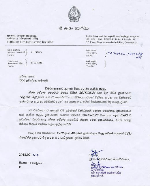 මේ සම්බන්ධයෙන් පොලිස් ත්රස්ත විමර්ශන කොට්ඨාශය විසින් පසුගිය 04 වැනිදා රිවිර ප්රධාන කතෘ වෙත ලිඛිතව දන්වා තිබේ.