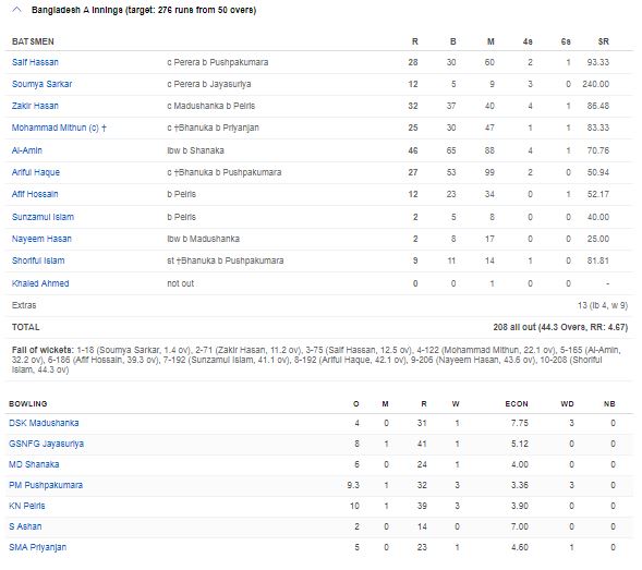 මේ අනුව ලකුණු 276 ක ජයග්‍රාහි ඉලක්කයක් හඹා ගිය බංග්ලාදේශ ඒ කණ්ඩායම පන්දුවාර 44 යි පන්දු 03 කදී සියළු දෙනා දැවි ලබා ගැනිමට සමත් වුයේ ලකුණු 208 ක් පමණි.