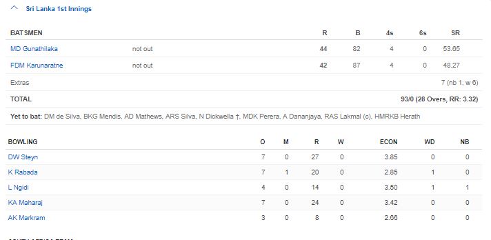 සංචාරක දකුණූ අප්රිකා කණ්ඩායම සමග කොළඹ එස්.එස්.සී ජාත්යන්තර ක්රීඩාංගණයේදි අද (20) ආරම්භ වු දෙවැනි ටෙස්ට් ක්රිකට් තරගය දිවා අාහාරය සඳහා අත්හිටුවන විට, කාසියේ වාසිය දින සිය පළමු ඉනිමට පන්දුවට පහර දෙන ශ්රී ලංකා කණ්ඩායම කිසිඳු කඩුල්ලක් නොදැවි ලකුණූ 93 ක් ක් ලබා සිටියේය.