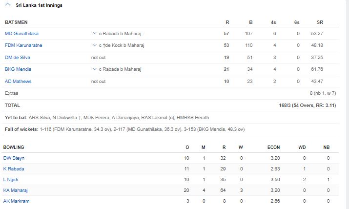 සංචාරක දකුණූ අප්රිකා කණ්ඩායම සමග කොළඹ එස්.එස්.සී ජාත්යන්තර ක්රීඩාංගණයේදි අද (20) ආරම්භ වු දෙවැනි ටෙස්ට් ක්රිකට් තරගය තේ පානය සඳහා අත්හිටුවන විට, කාසියේ වාසිය දින සිය පළමු ඉනිමට පන්දුවට පහර දෙන ශ්රී ලංකා කණ්ඩායම කිසිඳු කඩුලු 03 ක් දැවි ලකුණූ 168 ක් ක් ලබා සිටියේය.