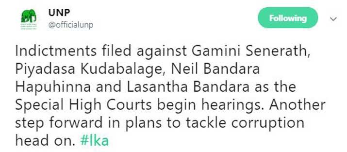 මහා පරිමාණ දූෂණ හා වංචා සම්බන්ධයෙන් වන නඩු ඇසීම සඳහා විශේෂ පාර්ලිමේන්තු පනතක් මගින් ස්ථාපිත කළ විශේෂ මහාධිකරණයේ නඩු විභාග කිරීම ආරම්භ කළ බව එක්සත් ජාතික පක්ෂය සිය නිල ට්ව්ටර් ගිණුමෙහි පණිවිඩයක් තබමින් ප්‍රකාශ කර තිබේ.