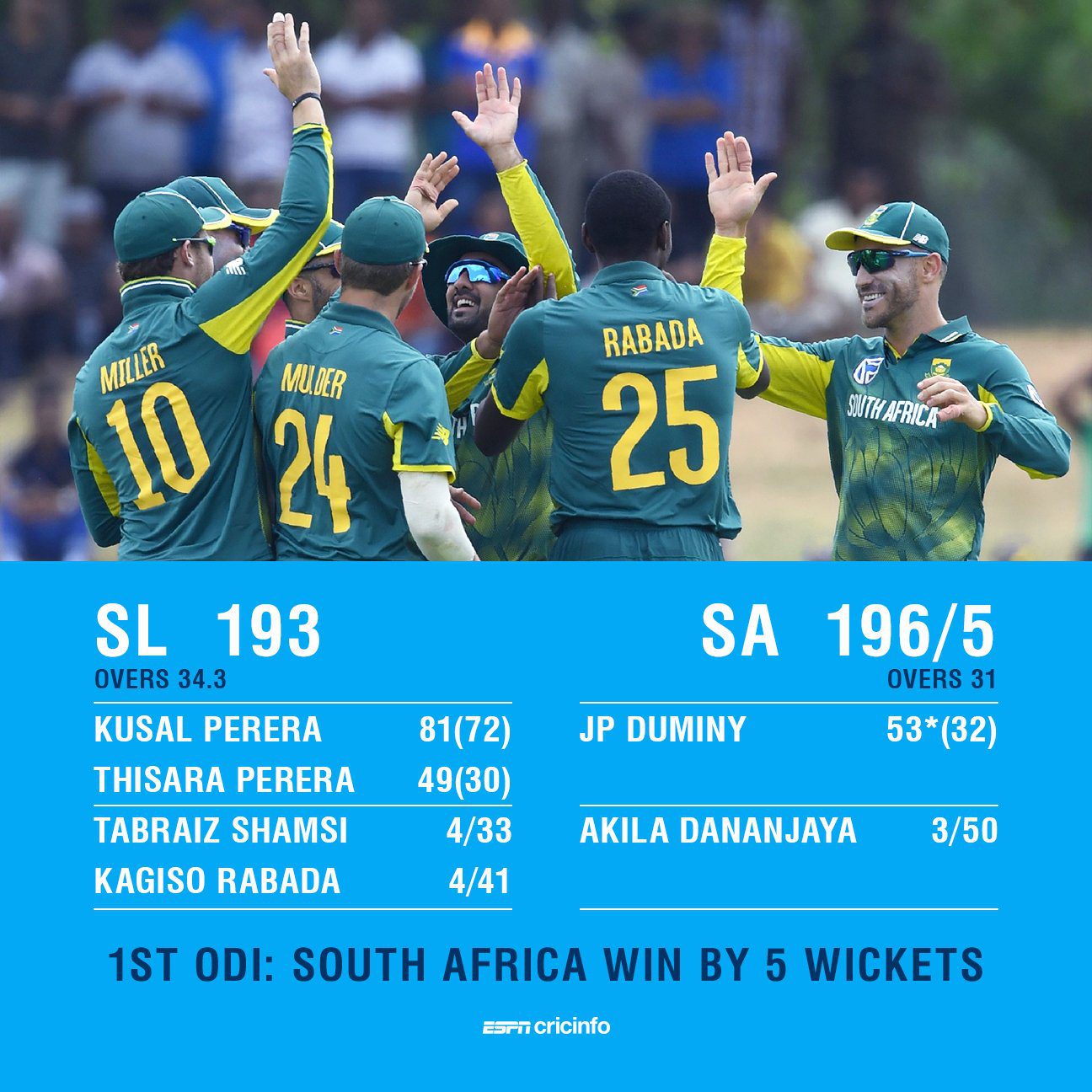 සංචාරක දකුණු අප්රිකා කණ්ඩායම හා ශ්රී ලංකා කණ්ඩායම අතර අද (29) දඹුල්ලේ පැවති පළමු එක්දින තරඟයෙන් කඩුළු 05 ක ජයක් ලැබීමට දකුණු අප්රිකාව සමත් විය.