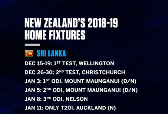 නවසීලන්ත ක්රිකට් ආයතනය විසින් 2018/19 ඉදිරි දේශීය තරග කාල සටහන නිකුත් කර ඇති අතර එ අනුව ශ්රී ලංකා කණ්ඩායම ලබන දෙසැම්බර් 05 වැනිදා නවසීලන්ත තරග සංචාරයක් ආරම්භ කිරිමට නියමීතය.