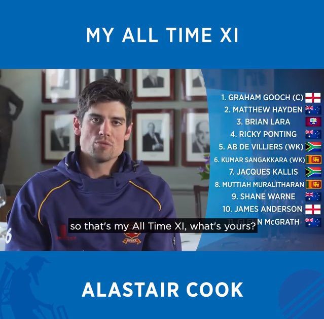ඉන්දීයාව සමඟ පැවැත්විමට නියමිත පස්වන හා අවසන් ටෙස්ට් ක්‍රිකට් තරගයෙන් අනතුරුව ජාත්‍යන්තර ක්‍රිකට් පිටියෙන් සමුගැනිමට නියමිත, එංගලන්ත හිටපු ටෙස්ට් ක්‍රිකට් නායක ඇලෙස්ටයාර් කුක් සිය “MY All TIME XI” ප්‍රකාශය⁣ට පත් කර තිබේ.