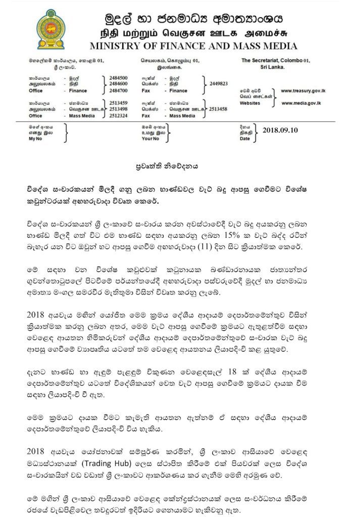 ඒ අනුව විදේශ සංචාරකයන් ශ්‍රී ලංකාවේ සංචාරය කරන අවස්ථාවේදී වැට් බදු අයකරනු ලබන භාණ්ඩ මිලදී ගත් විට එම භාණ්ඩ සඳහා අයකරනු ලබන 15% ක වැට් බද්ද රටින් බැහැර යන විට ඔවුන් හට ආපසු ගෙවීම සඳහා මෙම කාර්යාලය විවෘත කෙරෙනු ඇත.