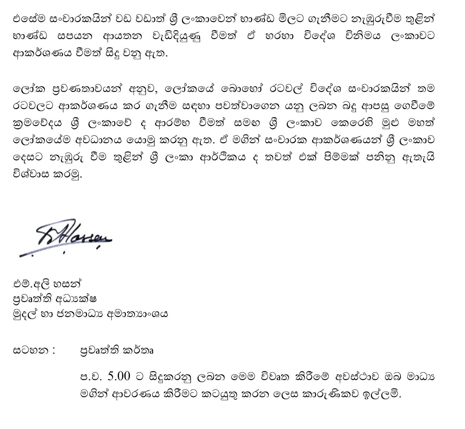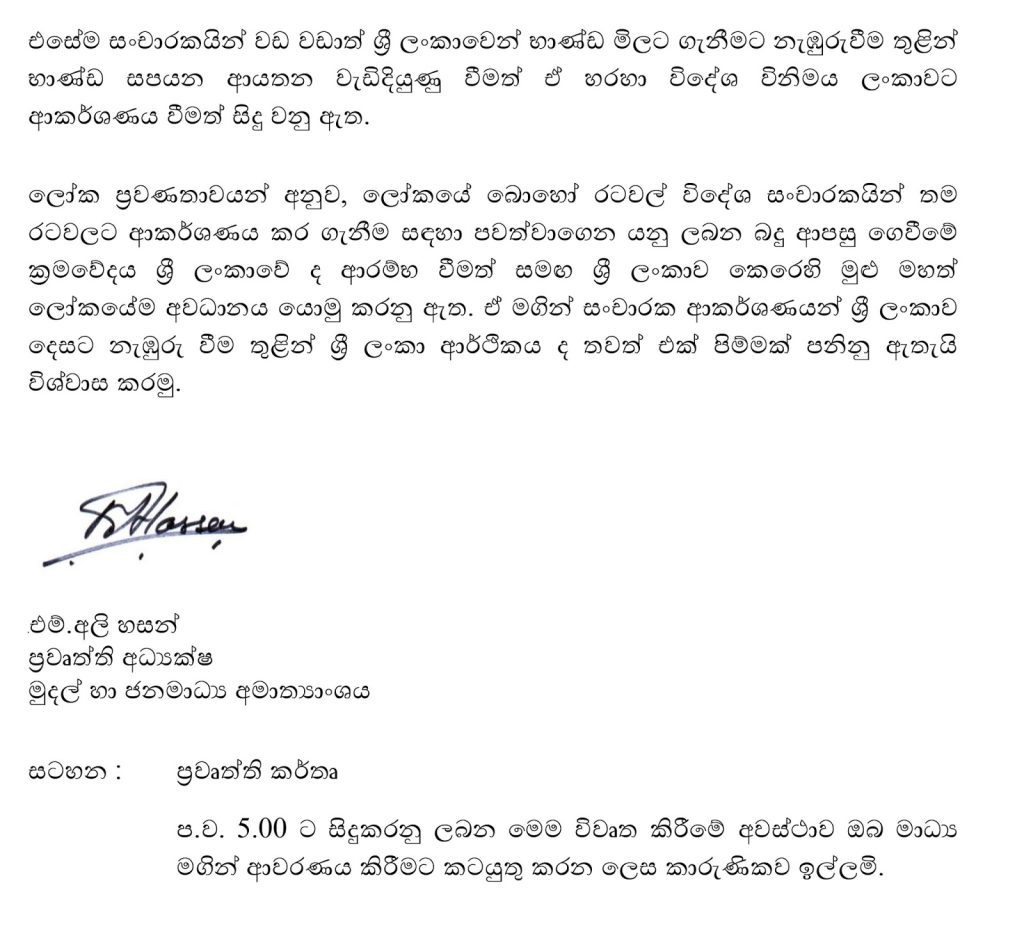 මේ හෙට (11) පස්වරුවේදී මුදල් හා ජනමාධ්‍ය අමාත්‍ය මංගල සමරවීර මහතා මෙම කාර්යාලය විවෘත කරන බවද එම නිවේදනයෙහි සඳහන් වෙයි.