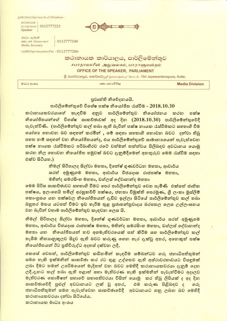 පාර්ලිමේන්තුව කල් තබා බහුතර මතය යටපත් වීමට ඉඩ හැරිම තුල ප්‍රජාතන්ත්‍රවාදය බරපතල ලෙස උල්ලංඝනය වි ඇති බවත් එහෙයින් කඩිනමීන් පාර්ලිමේන්තුව කැඳවන ලෙස එක්සත් ජාතික පක්ෂය,ඉලංගෙයි තමීල් අරසු කච්ච්,ජනතා විමුක්ති පෙරමුණ,මුස්ලිම් ක්‍රොංග්‍රසය යන පක්ෂවල නියෝජීතයින් මෙහිදි කථානායකවරයාගෙන් ඉල්ලා ඇති බවද එම නිවේදනයෙහි සඳහන් වෙයි.