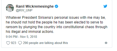 හිටපු අගමැති රනිල් වික්රමසිංහ මහතා සම්බන්ධයෙන් ජනපති මෛත්රීපාල සිරිසේන මහතා ඊයේ (05) පාර්ලිමේන්තු පරිශ්රයේ “ජන මහිමය” රැළියේදී දැක්වූ අදහස් සම්බන්ධයෙන් වික්රමසිංහ මහතා සිය ට්විටර් ගිණුමෙන් අදහස් දක්වා තිබේ.
