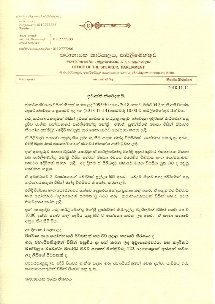 ඉදිරි පියවර ගන්නා ලෙස කථානායකගෙන් ජනපතිට ලිපියක් යැවෙයි..