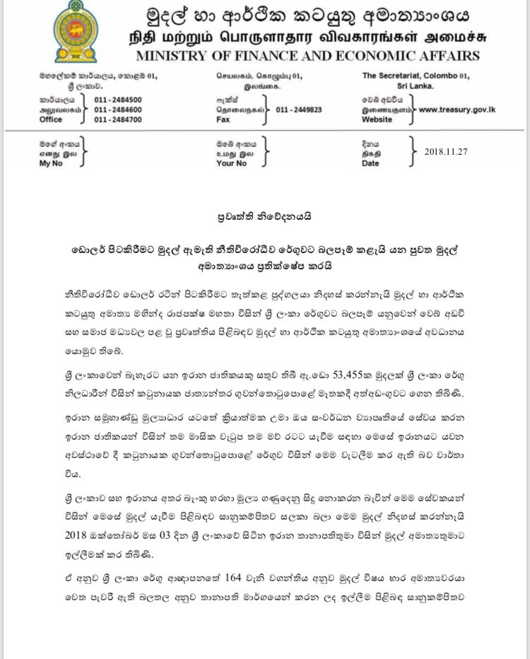 ඩොලර් පිට කිරිමට මුදල් අමාත්යවරයා නීති විරෝධිව රේගුවට බලපෑම් යන පුවත මුදල් හා ආර්ථික කටයුතු අමාත්යාංශය නිවේදනයක් නිකුත් කරමීන් සඳහන් කරයි.