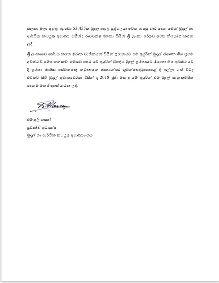 ශ්රී ලංකාව හා ඉරානය අතර බැංකු හරහා මුල්ය ගණූදෙනු නෙකෙරෙන බැවින් මෙසේ මුදල් යැවිම සම්බන්ධයෙන් සානුකම්පිතව සලකා බලා මෙම මුදල් නිදහස් කරන්නැයි ඉරාන තනාපතිවරයා කල ඉල්ලිමක් මත එය සලකා බලා මෙම කටයුත්ත මුදල් අමාත්යවරයා විසින් සිදුකර ඇති බව එම නිවේදනය මගින් අවධාරණය කර තිබේ.
