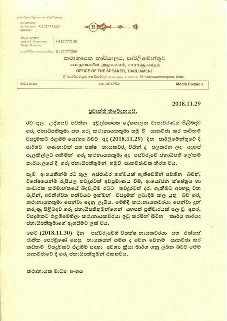 රටතුළ උද්ගතව තිබෙන අවුල්සහගත දේශපාලන වාතාවරණය නිමා කිරීම සඳහා කඩිනම් විසඳුමකට එළඹීමේ ක්රියාමාර්ග ගැනීමට කථානායකවරයා සමඟ අද (29) පැවැති සාකච්ඡාවේදී ජනාධිපතිවරයා එකඟතාවය පළකළ බව කතානායක කාර්යාලය නිවේදනයක් නිකුත් කරමින් සඳහන් කරයි.
