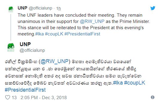 හිටපු අග්රාමාත්ය රනිල් වික්රමසිංහ මහතා අග්රාමාත්යවරයා ලෙස පත්කළ යුතුය යන එක්සත් ජාතික පෙරමුණේ නායකයන්ගේ තීරණයෙ වෙනසක් නොමැති බව එක්සත් ජාතික පක්ෂය සිය නිල ටිව්ටර් ගිණූමෙහි පණිවිඩයක් තබමීන් සඳහන් කර තිබේ.