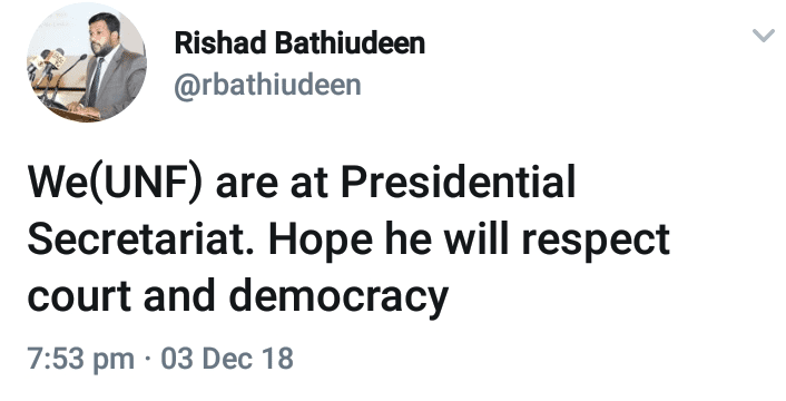 එක්සත් ජාතික පෙරමුණේ නියෝජිතයින් මිට ස්වල්ප වේලාවකට පෙර ජනාධිපති ලේකම් කාර්යාලට පැමීණි බව පාර්ලිමේන්තු මන්ත්රී රිෂාඩ් බදියුදීන් මහතා සිය ටිවිටර් ගිණුමෙහි පණිවිඩයක් තබමීන් පවසයි.