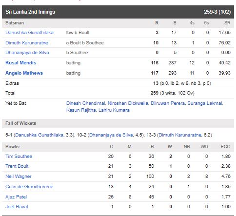 තරඟය අත්හිටුවන විට නොදැවි පන්දුවට පහර දෙමීන් සිටි කුසල් මෙන්ඩිස් ලකුණූ 116 (287) ක් සහ ඇන්ජලෝ මැතිව්ස් 117 (293) රැස් කරගෙන සිටියහ.