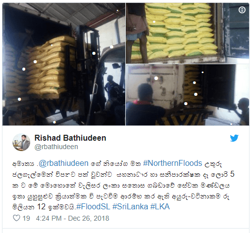 උතුරු පළාතට බලපෑ අධික ගංවතුරෙන් පීඩාවට පත්ව සිටින ජනතාවට අවශ්‍ය කරන වියළි ආහාර ද්‍රව්‍ය වහාම සපයන ලෙස කර්මාන්ත හා වාණිජ කටයුතු, දිගුකාලීනව අවතැන්වූ පුද්ගලයන් නැවත පදිංචි කිරීම සහ සමූපකාර සංවර්ධන අමාත්‍ය  රිෂාඩ් බදියුදීන් මහතා උපදෙස් ලබාදී ඇත.
