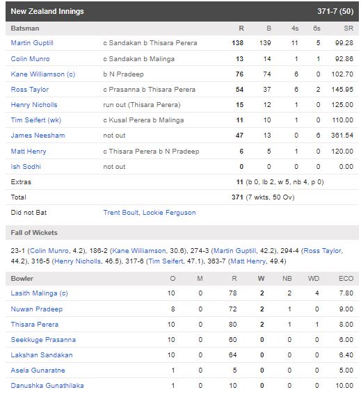 නවසීලන්ත කණ්ඩායම වෙනුවෙන් පන්දු 139 කදී ලකුණූ 138 ක් වාර්තා කිරිමට මාටින් ගප්ටිල් සමත් වු අතර නායක විලියම්සන් ලකුණු 76 ක් හා රොස් ටේලර් ලකුණූ 54 ක් රැස් කළේය.